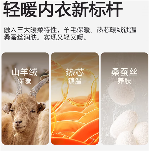 融入三大暖柔特性,羊毛保暖、热芯暖绒锁温、桑蚕丝润肤。实现又轻又暖。