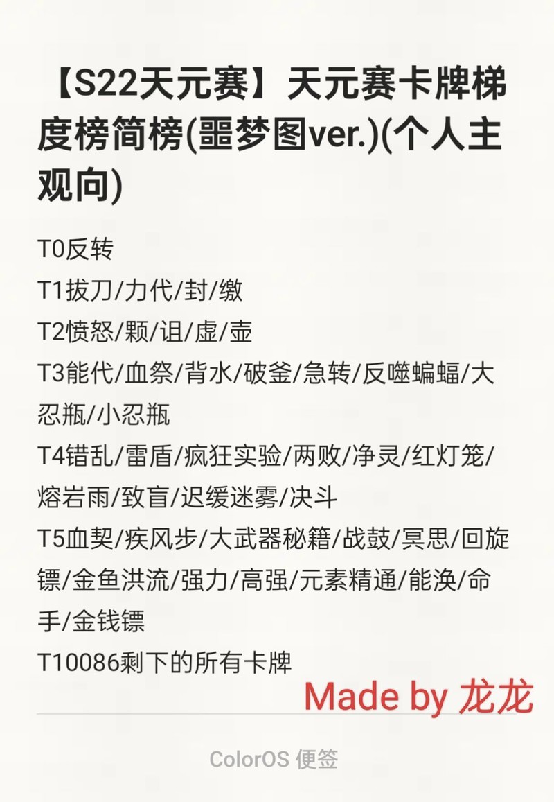 每张卡牌都有其独特作用,在不同场景中发挥价值。T1卡牌未必始终强于T2,T4也不一定弱于T2。事实上,只有T0卡牌具备对下级卡牌的绝对压制力,其他梯度之间并不存在单向压制关系。需要特别说明的是,天元赛与33存在明显差异,选卡时应灵活应对,切勿僵化套用固定模式。