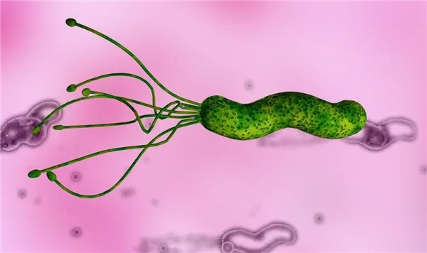 幽门螺旋杆菌(Helicobacter pylori,简称 Hp)是一种寄生在人类消化道中的微需氧革兰氏阴性杆菌,呈螺旋或 S 形,一端带有鞭毛,能在胃中强酸性环境中生存并穿过黏液层,到达上皮表面并牢牢连接,避免被胃排空。最喜欢胃的幽门、胃窦部位,便因此而得名。