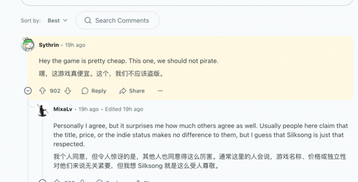 《丝之歌》一发售,Reddit 的盗版游戏板块最热帖自然是这款游戏,不过和以往大家讨论游戏盗版方法不同,不少玩家呼吁大家购买正版,毕竟《丝之歌》价格确实太便宜了,而且品质也很优秀。