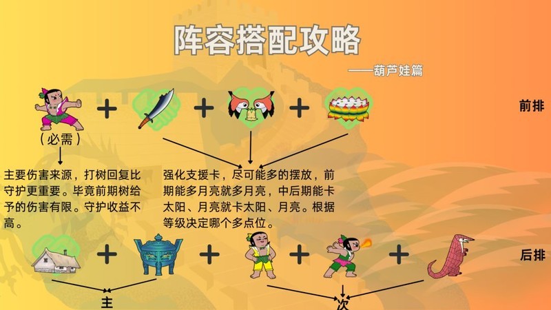 主核心保持不变,但卡牌搭配需要做出调整。由于世界之子的生存要求提高,敌方输出单位也更多,前期伤害足以造成我方减员。为了确保大娃能够持续在场作战,且攻击不会因血量减少而下降,三娃的气血遁变得尤为重要,同时四娃的援救效果也能有效发挥作用。