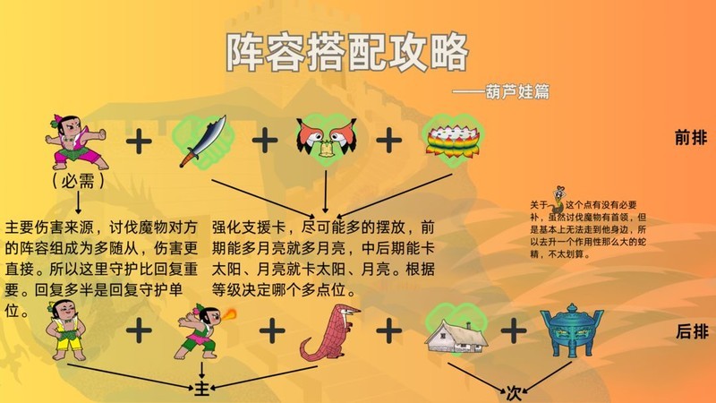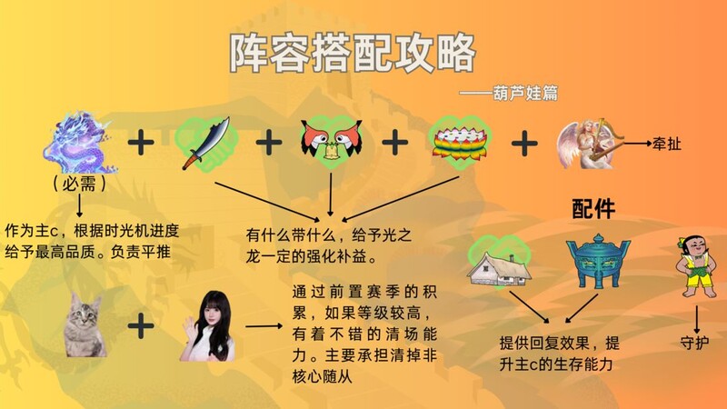 总结阵容搭配主要看卡牌自身强度和亲和度。而相关资源或可转化资源其实可以在前几个赛季积累。因此,若仅以非第一赛季为前提来分析葫芦娃阵容,有些卡牌就没必要特别提及,还可能误导那些一开始就选择二娃作为世界之子的玩家。
