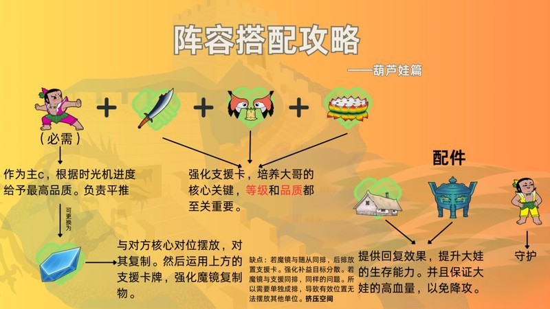 作为一张普通红色卡牌,大娃相对容易获得,是很多玩家的首选。灵露、莲花、蝎子精宝刀等支援卡牌在葫芦娃体系中具有通用性,建议优先升级。在布阵时,尽量让大娃享受到所有支援卡的加成效果。当然,也可以用魔镜替代大娃,将其放在与对方高战力随从对位的位置,支援卡则放在其后一排。不过从实战来看,魔镜的加成效果和转化能力在多数情况下仍不如大娃明显。而且魔镜作为核心卡牌,获取难度也比大娃高出不少。