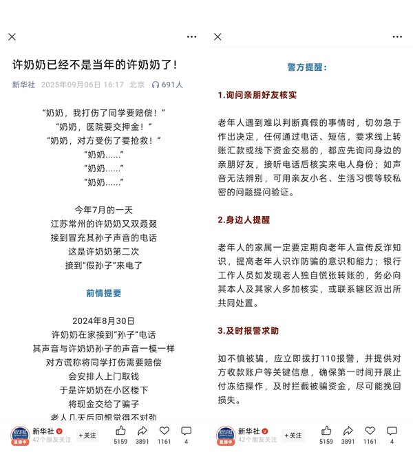 9月6日消息,据媒体报道,许奶奶在家接到“孙子”电话,对方声音和许奶奶孙子的声音一模一样,并跟许奶奶索要钱财。