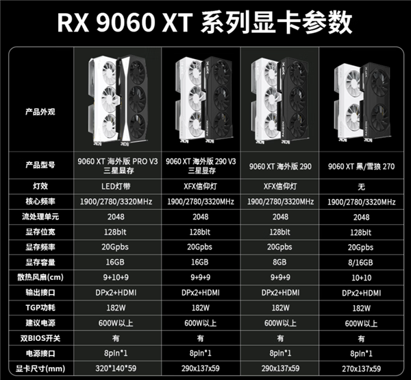 新卡包括RX 9060 XT海外版Pro V3(黑/白)、RX 9060 XT海外版290 V3(黑/白),价格分别为3099元、2899元,均以V3结尾,并在规格表中明确标注三星显存。
