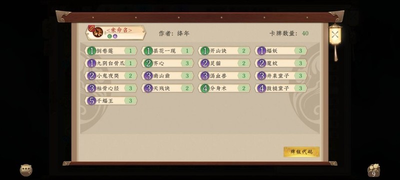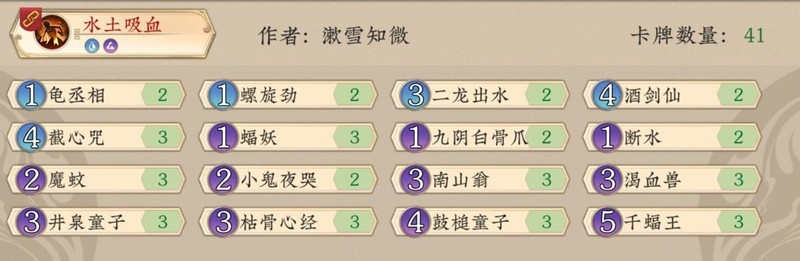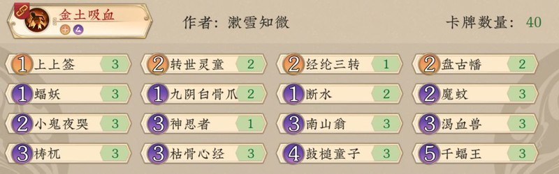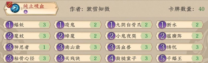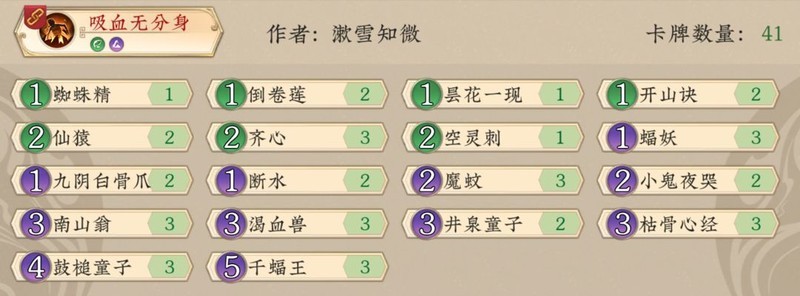 相比韦师傅的版本,去掉了分身术和一张神思、井泉,灵猫替换为仙猿,补充了两张断水中期弃牌作为法抗和骨爪来止损防卡场,加入一张蜘蛛精以润滑低费曲线,40玩家可根据环境酌情减少一张针对卡。