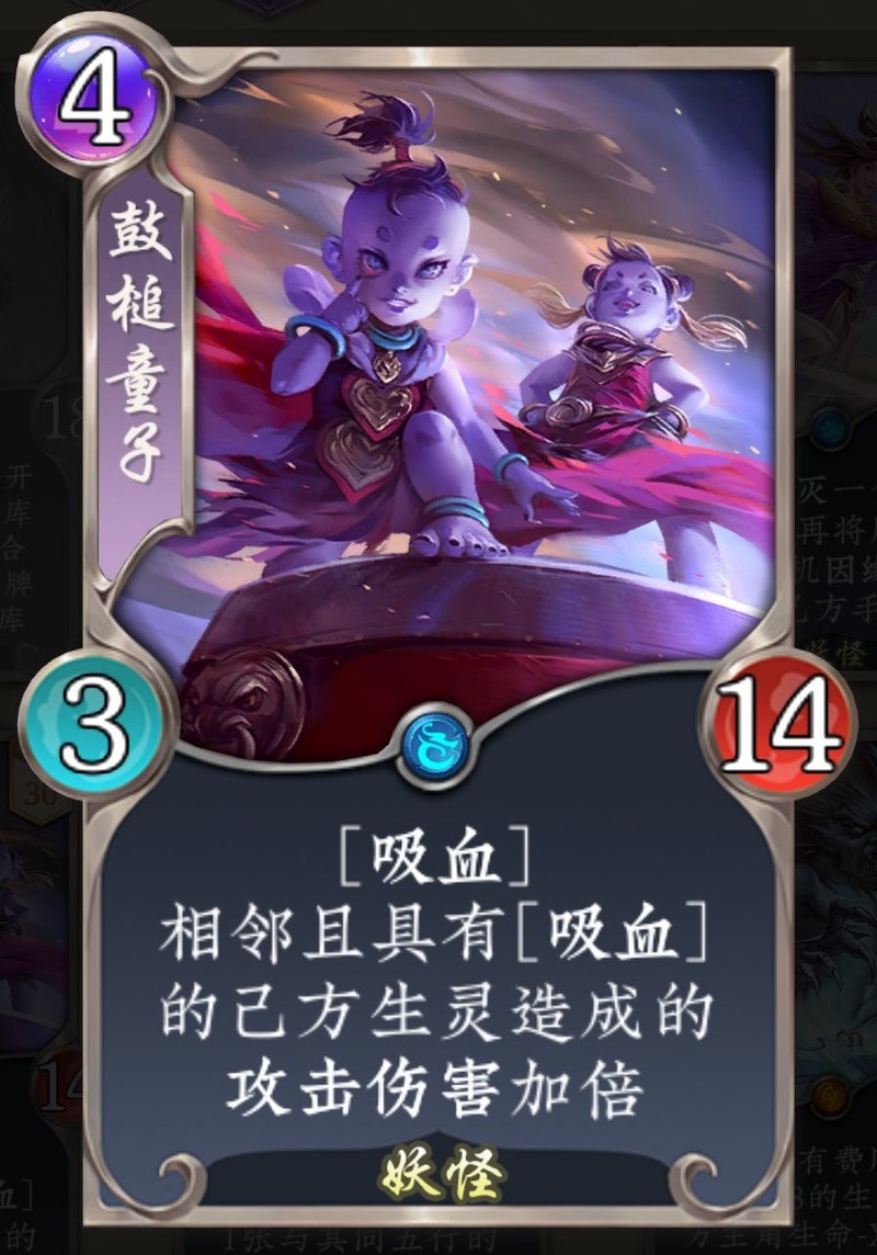 吸血套如今能够崛起,主要得益于改版后枯骨、南山翁与鼓槌组合所带来的超高爆发,不过这套卡组的整体素材其实并不够完善。吸血生灵之间需要依靠站场配合才能发挥出更强的效果,例如南山翁搭配鼓槌的爆发、井泉依赖其他吸血生灵在场等,不像许多进场套那样只需触发进场效果即可。这也使得吸血套难以很好地与潜龙、还阳这类跳费铺场体系融合,大多选择按费拍怪的节奏构筑。而在按费拍怪的卡牌选择上,三费优质的吸血生灵非常多,但一二费只有蝠妖和魔蚊可用,导致曲线分布不均。因此,吸血套往往需要加入一些非吸血生灵来优化节奏。