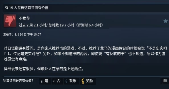 出于语言限制,我只浏览了Steam的评论,其中比较微妙的是,只有一位日语玩家留下了“为什么历史人物传记漫画不算史实”的困惑评论。