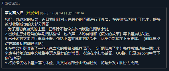 面对这些反馈,游戏及时做出了相应的处理。因为快速的反应和诚恳的态度,《小小书店》在中文社群中口碑也有所回升。