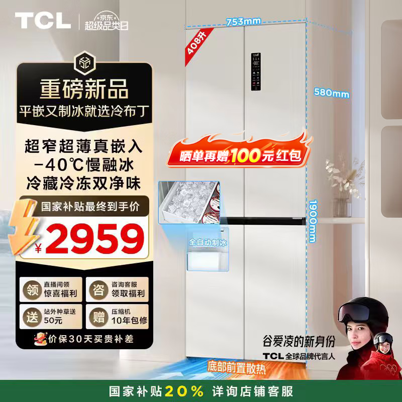 TCL冷布丁408升电冰箱,超薄嵌入小户型