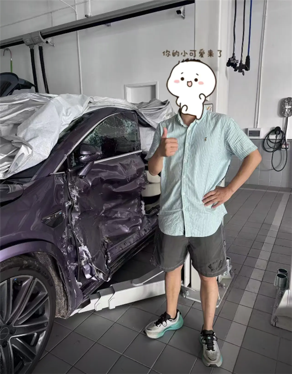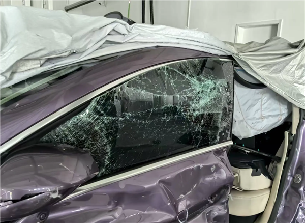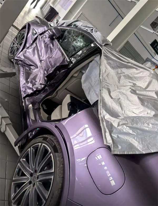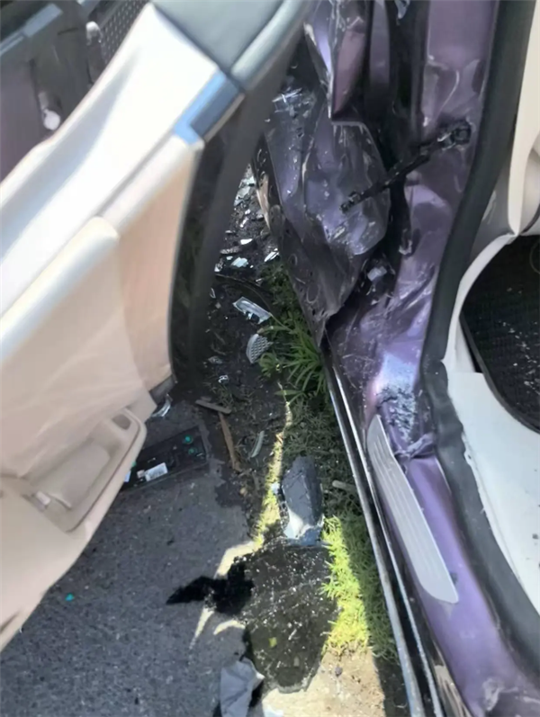 从现场图片看,这辆紫色的智界R7受损严重,右侧两扇车门为正面冲击受力点,车窗玻璃碎裂,侧面安全气帘弹出。不过整车框架完整,一家人也安然无恙,仅仅车主本人被安全带勒到了肚皮,去医院检查后发现并无大碍。