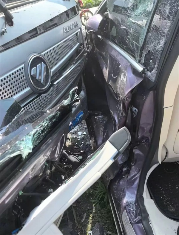 从其在群聊里发布的内容看,当时车主开车载着一家人前往乡下,经过一个十字路口时,被一辆司机分心驾驶的满载货车正面冲撞,并挤到护栏外。