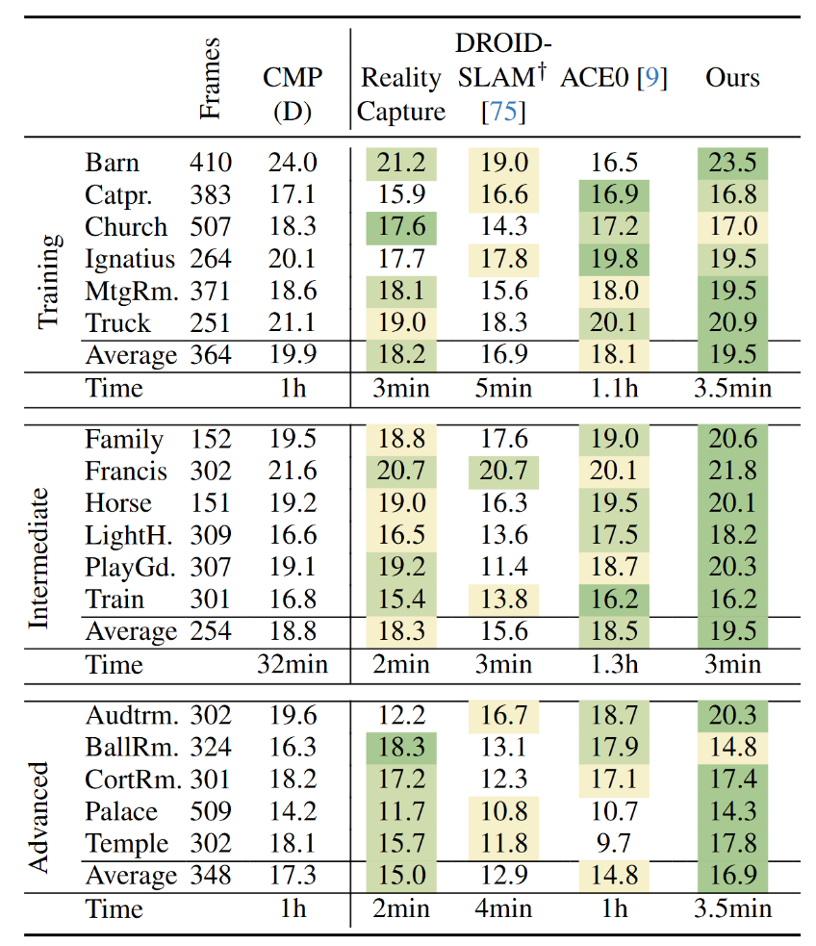 由于传统相机位姿的数据集提供的相机位姿通常是由传统的 SfM 或 SLAM 方法计算得到的,因此这些相机位姿本身可能存在一定的误差。为了更客观地评估 SAIL-Recon 的性能,论文使用了与 ACE0 一致的新视角合成指标 PSNR 来评估相机位姿的准确度。在训练 NeRF 用于新视角合成的过程中,如果训练图像的相机位姿存在误差,那么 NeRF 的合成效果会受到影响,PSNR 值也会降低。如果测试图像的相机位姿准确,则合成的图像 PSNR 值会更高。因此,PSNR 值可以作为评估相机位姿准确度的一个指标。