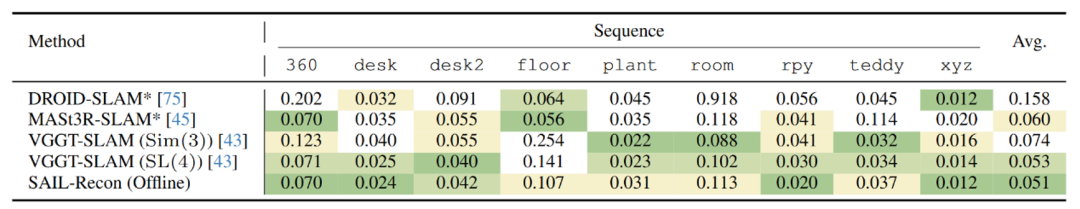 在 TUM-RGBD 数据集上,SAIL-Recon 同样表现出色,在给定的数千帧图像中,效果与现有的 SLAM 方案接近。需要注意的是 SAIL-Recon 是一个离线重建方法,并没有利用时序上的连续性信息。