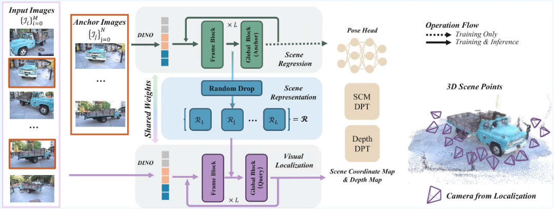 在 3D 视觉领域,3D 场景回归模型(如 VGGT)虽能通过输入图像直接预测相机位姿与三维结构,但在极端视角变化场景中表现出色的同时,却受限于大规模图像输入的处理能力,仅能处理几百张图像进行位姿估计和 3D 重建。为此,论文推出全新解决方案 SAIL-Recon,一种增强型场景回归网络,通过融合视觉定位能力,构建专为大规模运动恢复结构(SfM)设计的前馈 Transformer 架构。