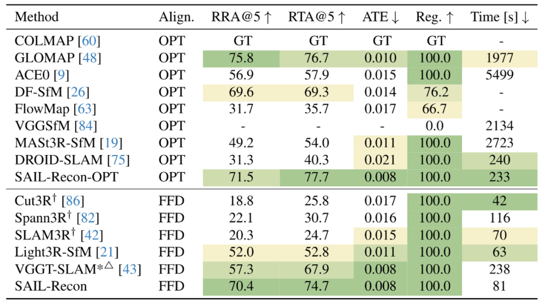 在 Tanks and Temples 数据集上,SAIL-Recon 在所有场景中均表现出色,在所有非优化的方法中,取得了最强的性能。而 VGGT 因为无法处理大规模图像集合,在该数据集上无法运行。其他的 3R 方法精度均不如 SAIL-Recon。在优化的方法中,SAIL-Recon 的表现也非常接近最优的方法 GLOMAP。