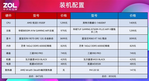 装机上,因为AMD 锐龙5 9500F拥有出众的能耗比,可以选择原装散热器,省下百元预算。同时也能搭配华硕B850M AYW GAMING WIFI这种入门级别的主板,足以发挥出全部性能,对比竞品又能减少主板的支出。所以我们上面这套配置在AMD 锐龙5 9500F这边显卡升级到更高一级的RX 9070 GRE 12G的情况下,整体平台装机成本依旧要比酷睿i5-14600KF更低。装机牵一发而动全身,这就是AMD锐龙9000带来的全平台性价比优势,通过CPU来为用户节省装机成本,用相同甚至更低的预算打造性能更强劲的平台