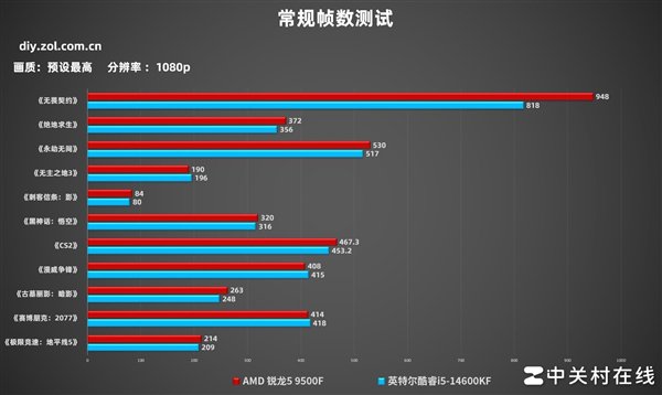 在1080p的常规帧数中,AMD 锐龙5 9500F对比英特尔酷睿i5-14600KF总共有8款游戏占据领先优势,网游除了《无主之地3》和《漫威争锋》外其余均有更好表现。
