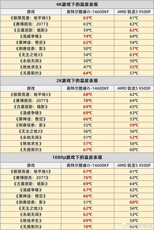 得益于Zen5架构的优化,Zen5架构这次在温度表现上非常出色,在1080p和2K分辨率温度普遍要低酷睿i5-14600KF一些,4K分辨率下,两款处理器温度表现平分秋色,不过AMD 锐龙5 9500F没有达到过70℃以上,能耗比方面算是继承了锐龙9000系列的特色,难怪AMD依旧给大家配备了免费幽灵散热器,确实足够大部分用户使用了。