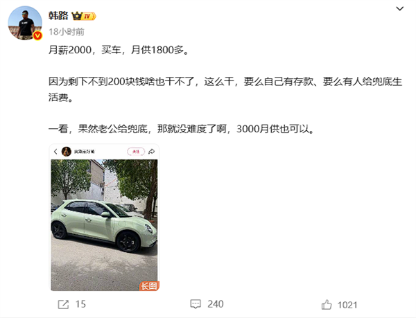 此事引发网友关注,知名汽车博主韩路表示:“月薪2000,买车,月供1800多。因为剩下不到200块钱啥也干不了,这么干,要么自己有存款、要么有人给兜底生活费。一看,果然老公给兜底,那就没难度了啊,3000月供也可以。”