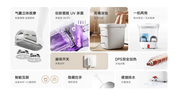 米家智能气囊足浴器2采用创新管路UV杀菌方式,泡脚过程中实时杀菌,全水域循环杀菌。