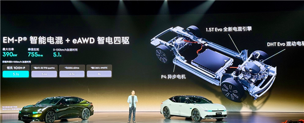 动力部分,领克10 EM-P搭载插电混动系统,由1.5T发动机+P1+P3+P4电机组成,系统综合最大功率390kW,峰值扭矩755牛·米,全系智电四驱,馈电油耗4.2L/100km。电池容量为18.4/38.2kWh两款,对应CLTC纯电续航分别为120/240km。