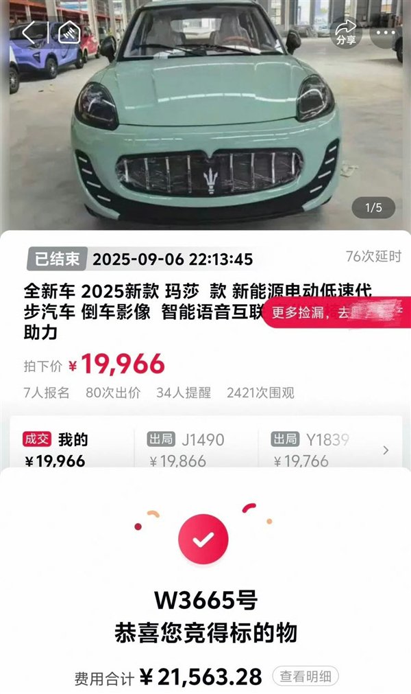 快科技9月9日消息,近日,广东的冯先生在某线上拍卖平台,以19966元拍下了一辆“玛莎拉蒂”,加上佣金等总共需支付21563元。