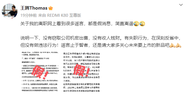 他表示:“关于我的离职网上看到很多谣言,都是假消息,简直离谱。说明一下,没有窃取公司机密出售,没有收人钱财。有失职行为,在深刻反省中,但没有做违法行为!谣言止于智者,还是请大家多关心未来要上市的新品吧。”