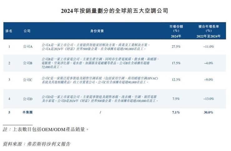比如,在招股书中,根据咨询公司弗若斯特沙利文的资料,按2024年销量计算,公司是全球第五大空调提供商,市场份额达7.1%;同时是中国大众市场家用空调第一品牌,市场份额达25.7%。