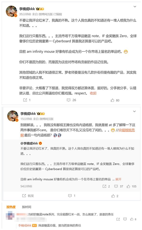 李楠表示,不要让我评论红米,我真的不熟,我们这行只看东西,主流市场千万级单品魅蓝Note、IF金奖魅族Zero、全球奢侈价位历史销量第一Cyberboard,我还算是可以的产品吧。