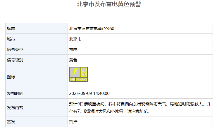 预计9日傍晚至夜间,北京市将自西向东出现雷阵雨天气,局地短时雨强较大,并伴有7、8级短时大风和小冰雹,请注意防范。