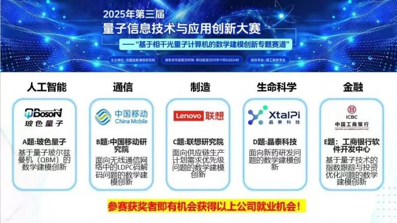 赛后研究基金奖励:每个赛题初赛排名前三的队伍(5道赛题共15支队伍)将受邀参加决赛线下答辩,依据现场评审结果排名分别获得5000元、3000元、2000元(共计5万元)的赛后研究基金。成绩优异的团队或个人有机会获得北京玻色量子科技有限公司及各出题单位的实习就业机会。