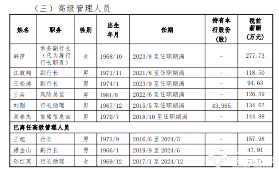 值得一提的是,王兵此前就备受重视。在2024年,王兵的税前薪酬达到了126.59万元,虽然远不如常务副行长韩萍的277.73万元,但比另外两位副行长的薪酬都高。