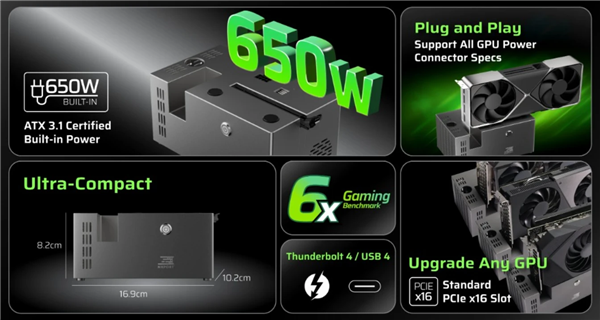 快科技9月9日消息,近日NXPort的一则广告显示推出全球最小的eGPU外接显卡扩展坞,内置650W电源,同时保持了极为紧凑的机身尺寸,仅为8.2 × 16.9 × 10.2 cm,使其成为市面上最小的外接显卡扩展盒之一。