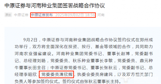 9月2日,在中原证券与河南种业集团的战略合作协议签约仪式上,滑欣辉已经以相关身份,跟随公司其他高管出席签约仪式。其排名顺序仅在执委会委员房建民之前。