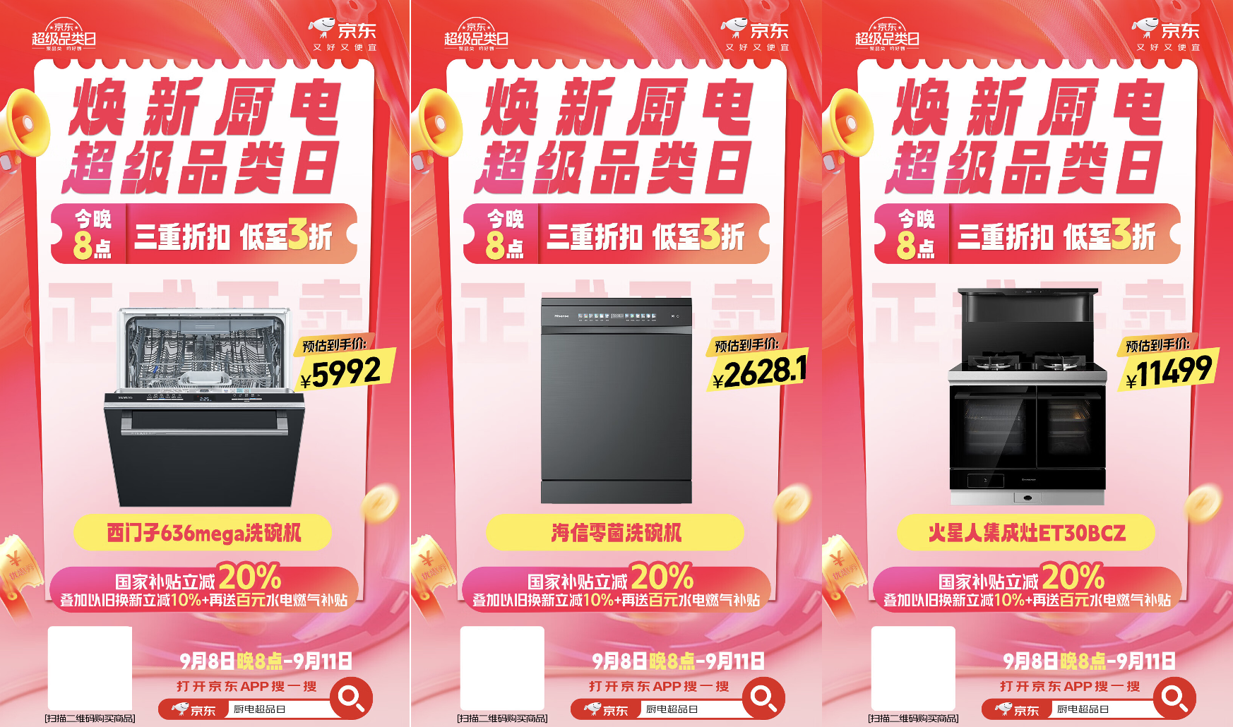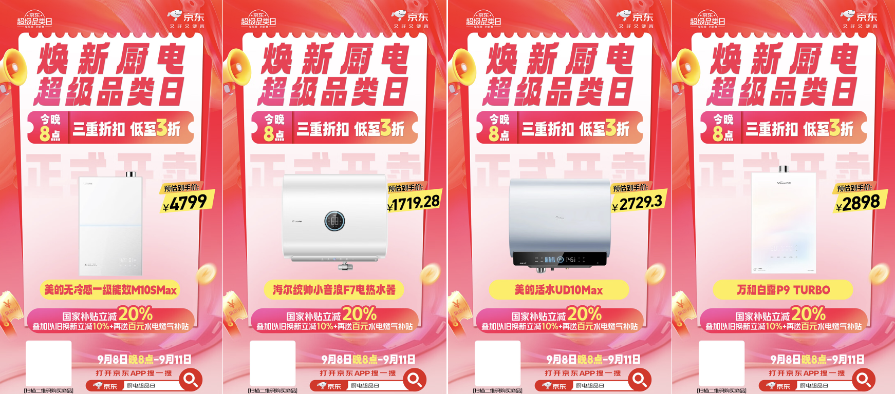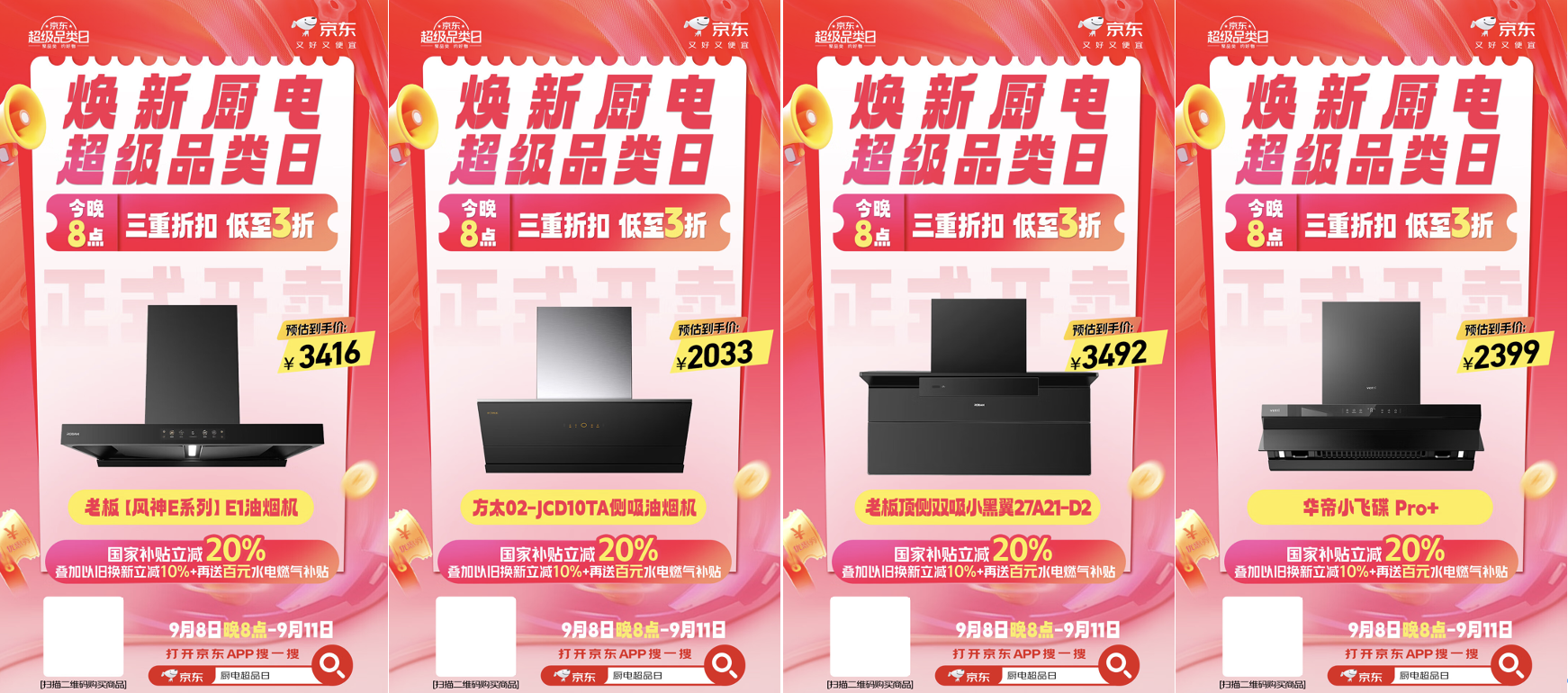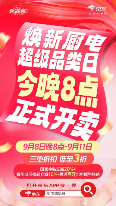 9月8日晚8点,京东焕新厨电超级品类日火热开启。为了让消费者能买到又好又便宜的厨电产品,京东携手方太、华帝、老板、海尔、美的、万和等家电品牌,带来多款爆品油烟机、热水器、洗碗机、燃气灶等。而且现在来京东焕新厨电超级品类日页面下单厨电产品,还可叠加国家补贴、以旧换新、百元水电燃气补贴三重折扣,部分产品价格低至3折!如果你想趁此机会换新,即日起至9月11日,记得锁定京东APP搜索“厨电超品日”。