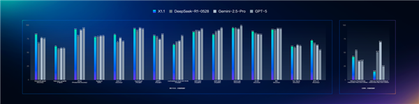 百度表示,在多个权威基准评测中,文心大模型X1.1整体表现超越DeepSeek R1-0528,在部分任务上展现出领先优势。同时,在与国际顶尖模型GPT-5和Gemini 2.5 Pro相比,效果持平。