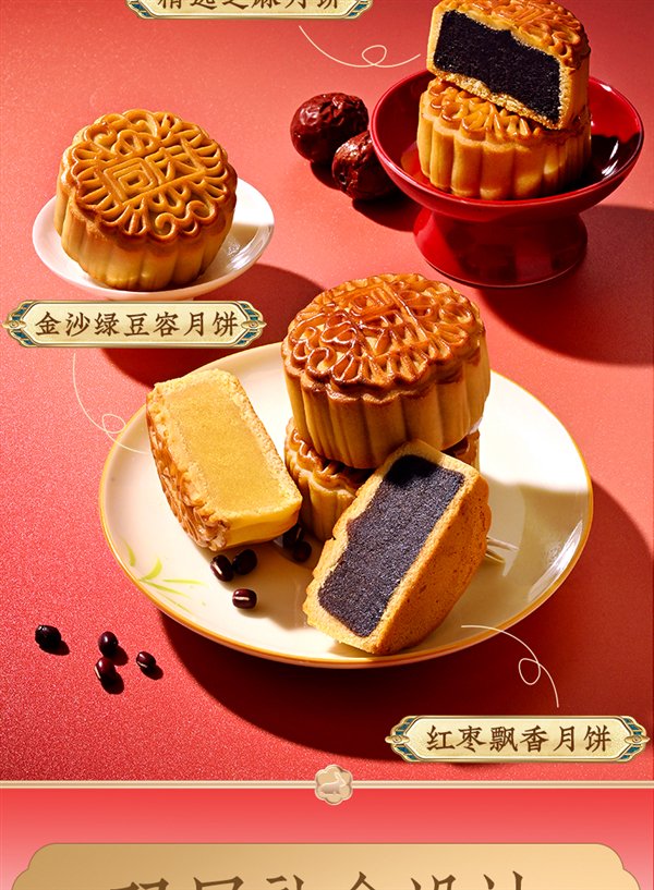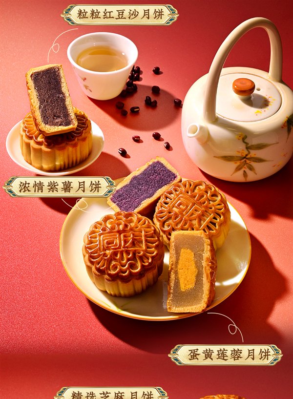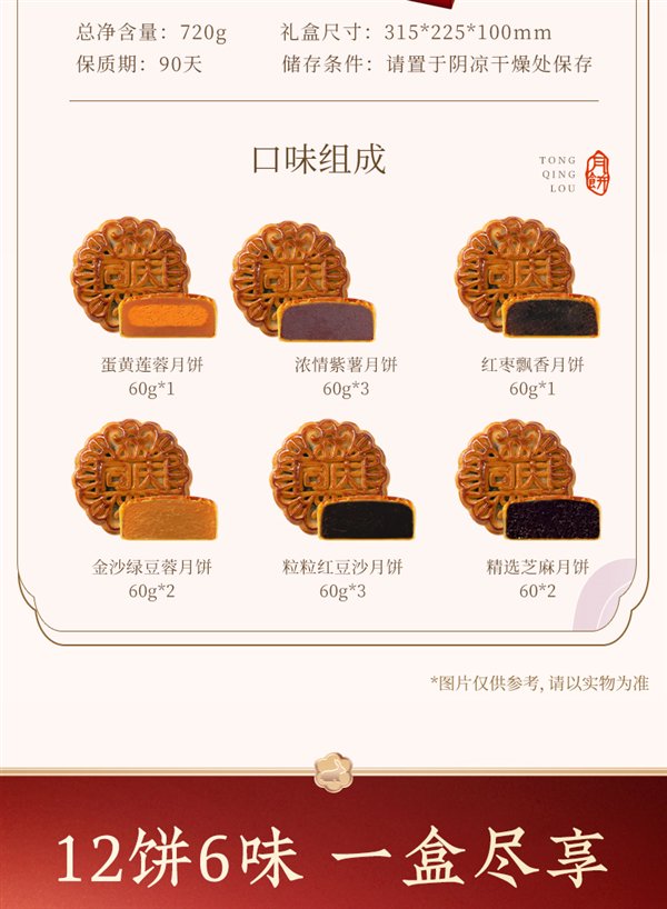 包含:蛋黄莲蓉月饼60g、浓情紫薯月饼60g x 3枚、红枣飘香月饼60g、金沙绿豆蓉月饼60g×2枚、粒粒红豆沙月饼60g×3枚、精选芝麻月饼60g×2枚。