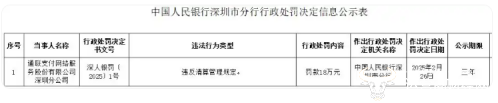 运营商财经网发现,今年三月份,中国人民银行深圳市分行公布一则行政处罚公示信息,通联支付因违反清管理规定被央行罚款18万元。
