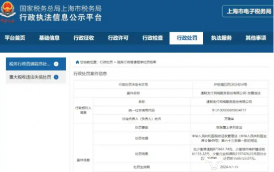 而去年通联支付就曾因为税务问题而被罚。2024年7月,国家税务总局上海市税务局公布处罚结果,通联支付因少缴纳多项税款包括少缴增值税约87.37万元、少缴城市维护建设税约6.12万元、少缴企业所得税约219.74万元,而被处百分之五十的罚款,合计罚款约156.61万元。