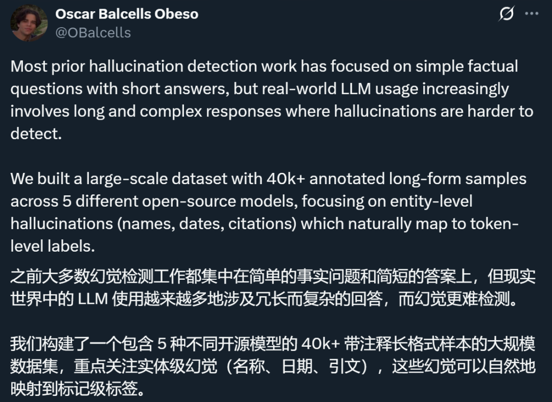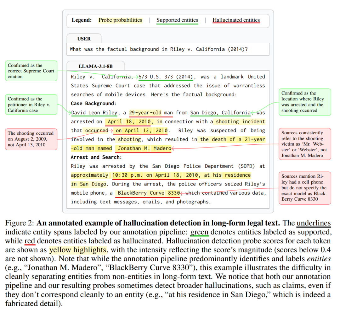 该方法的核心是精准识别实体级幻觉,例如捏造的人名、日期或引文,而非判断整个陈述的真伪。这种策略使其能够自然地映射到 token 级别的标签,从而实现实时流式检测。