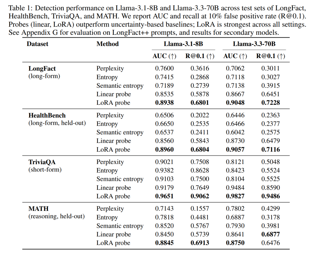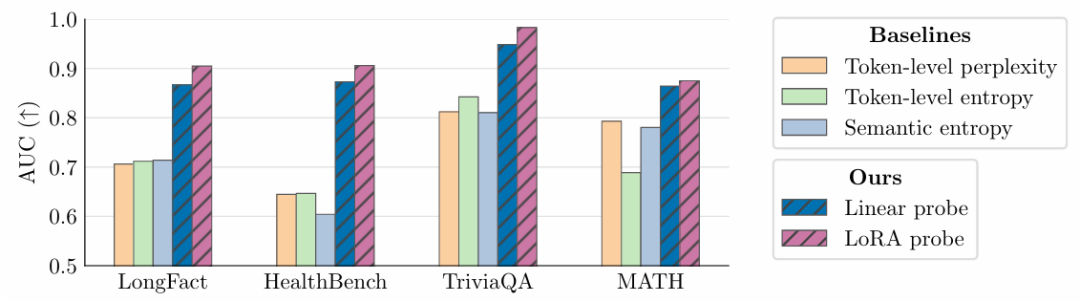在长文本设置中(LongFact 和 HealthBench),token 级探针在两个主要模型上的表现都显著优于基线方法(表 1)。简单的线性探针始终实现了 0.85 以上的 AUC 值,而 LoRA 探针进一步提升了性能,将 AUC 推高到 0.89 以上。
