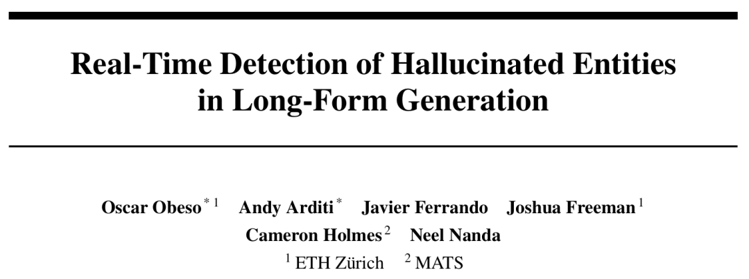 针对这一挑战,来自苏黎世联邦理工学院(ETH)和 MATS 的一项新研究提出了一种低成本、可扩展的检测方法,能够实时识别长篇内容中的「幻觉 token」,并成功应用于高达 700 亿(70B)参数的大型模型。