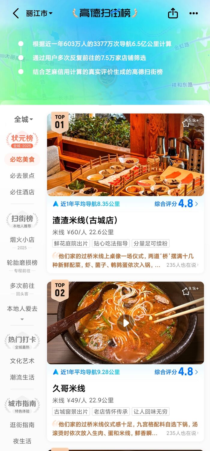 高德主打“扫街榜”,强调“基于用户行为”而非主观评价,试图以出行和地理位置数据为基础,构建一个更客观、更动态的餐饮推荐体系。其发布的“烟火小店榜”首批覆盖全国61个城市共2962家小店,突出“深巷老店”“夫妻小店”等传统业态,显然意在切入美团大众点评尚未完全覆盖的长尾市场。高德地图CEO郭宁强调“扫街榜永不商业化”,直指行业中长期存在的“评价泡沫”问题,试图以“真实”建立差异化信任。