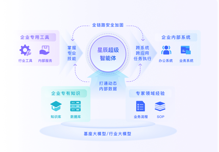 此外,星辰超级智能体可通过标准化API支持与企业OA、CRM、ERP等系统深度集成,实现跨系统流程自动化串联,真正做到与企业的业务中枢无缝连接,例如自动同步审批数据、触发业务流转,大大简化企业在使用过程中的系统切换流程,提升便捷易用度。