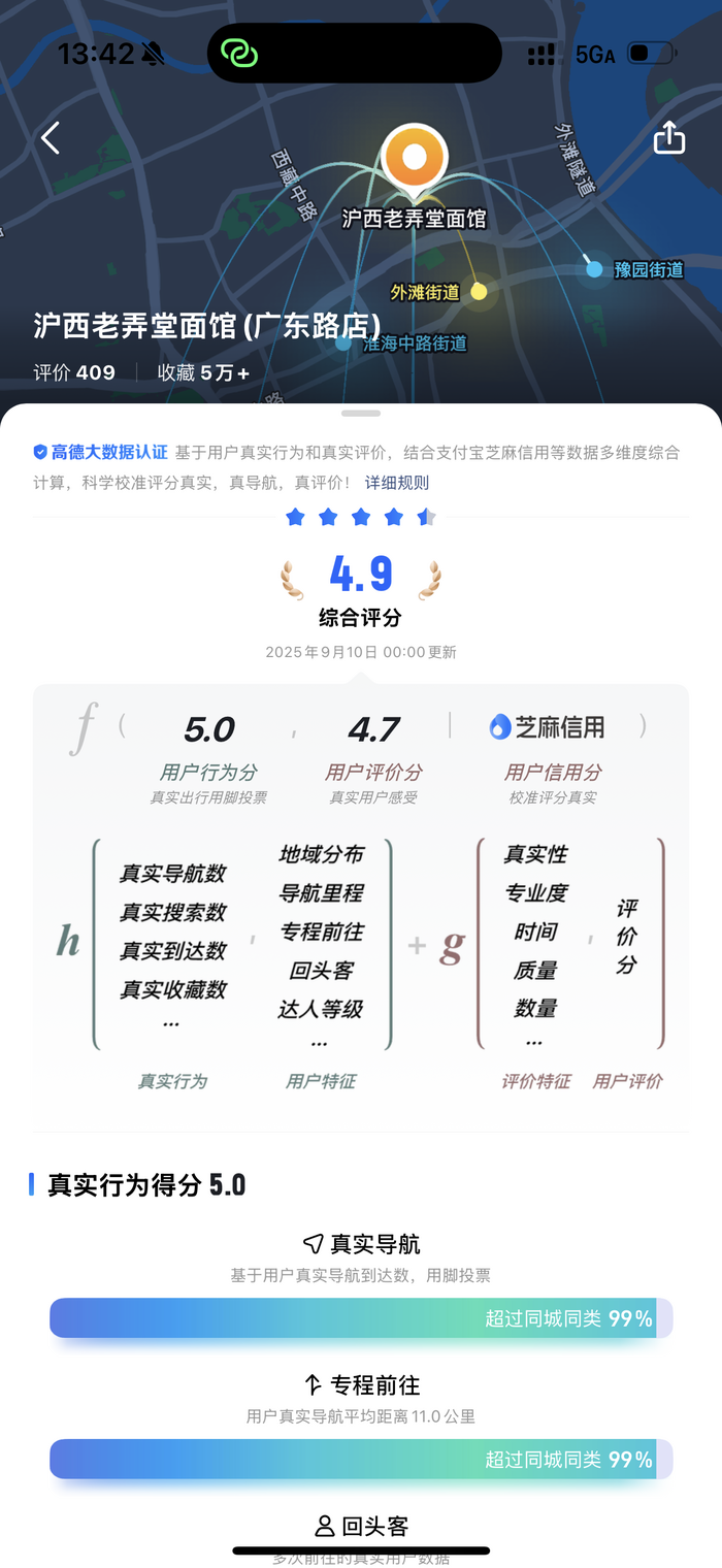 亿邦动力通过体验“扫街榜”,发现其评分体系由高德用户行为分、用户评价分和支付宝芝麻信用分构成。用户行为,纳入了真实导航数、搜索数、到达数、达人等级、回头客等维度,这些行为数据,相较刷好评而言造假难度高。据披露,高德地图覆盖全国超700万个餐厅点位,目前每天有1.2亿次生活服务相关搜索,导航前往1300万个生活服务目的地。此外,芝麻信用分800以上用户的评价,可能会影响商家的综合评分。