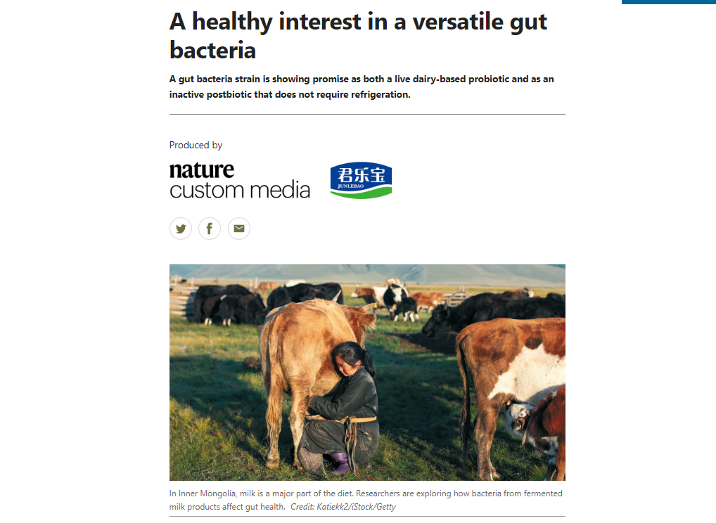 近日,全球顶级科研期刊《Nature》发表题为《A healthy interest in a versatile gut bacteria》的文章,刊登了君乐宝乳业集团在益生菌领域的最新研究成果。该成果充分展现了君乐宝在功能性菌株科研领域实现的重大突破,彰显君乐宝获得国际学术界的广泛认可,为其持续推进科研创新、深化产学研融合再添有力注脚。