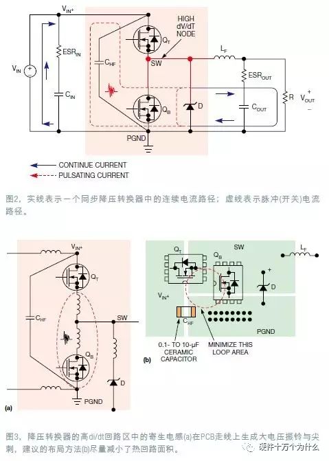 图2给出了一个同步降压转换器中的连续电流路径和脉冲电流路径,实线表示连续电流路径,虚线代表脉冲(开关)电流路径。脉冲电流路径包括连接到下列元件上的走线:输入去耦陶瓷电容CHF,上部控制FET QT以及下部同步FET QB,还有选接的并联肖特基二极管。