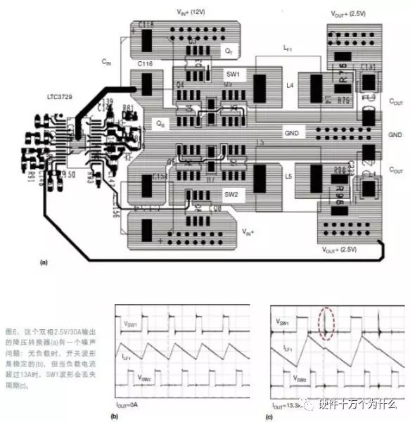 图5 显示的是升压转换器中的热回路与寄生PCB电感(a);为减少热回路面积而建议采用的布局(b)图5是升压转换器中脉冲电流回路的一个布局例子。此时关键在于尽量减小由开关管QB、整流二极管D和高频输出电容CHF形成的回路。图6提供了一个同步降压电路的例子,它强调了去耦电容的重要性。图6a是一个双相12VIN、 2.5VOUT/30A(最大值)的同步降压电源,使用了LTC3729双相单VOUT控制器IC,在无负载时,开关结点SW1和SW2的波形以及输出电感电流都是稳定的(图6b)。但如果负载电流超过13A,SW1结点的波形就开始丢失周期。负载电流更高时,问题会更恶化(图6c)。