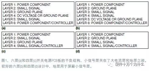 图1a和1c分别是六层和四层开关电源PCB的不良层结构。这些结构将小信号层夹在大电流功率层和地层之间,因此增加了大电流/电压功率层与模拟小信号层之间耦合的电容噪声。